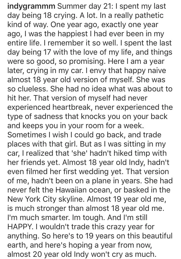 But then I think about 18 year old indy. Who I was one year ago. One day before I turned 19. June 17th, 2016. And it's like a totally different person.